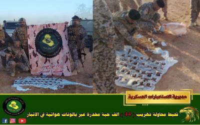 في عملية استخبارية عالية الدقة حملت بصمة الاحتراف واليقظة الميدانية أحبطت مفارز قسم الاستخبارات والامن في فرقة المشاة الخامسة مديرية الاستخبارات العسكرية وبعد متابعة دقيقة ومراقبة عبر الكاميرات الحرارية محاولة تهريب شحنة مخدرات خطيرة اعتمدت أسلوبًا غامضًا وغير مألوف عبر بالونات هوائية مزودة باجهزة الـ GPS حيث تم اسقاطها في وادي حوران بالأنبار تحتوي على ما يقارب 44 الف حبة نوع (كبتاجون) مخدرة
