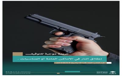 أكدت النيابة العامة في حسابها على إكس أن إطلاق النار في الأماكن العامة أو في المناسبات يُعد سلوكًا مُجرَّمًا، ويُشكّل جريمة موجبة للتوقيف وفق قرار معالي النائب العام (١) وتاريخ ١-١-١٤٤٢ هـ المحدد للجرائم الموجبة التوقيف وفقاً للمادة ١١٢ من نظام الإجراءات الجزائية.